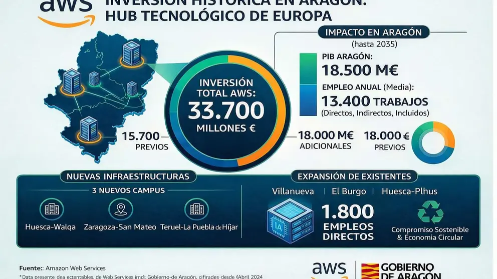 Amazon eleva a 33.700 millones su apuesta en datos e inteligencia artificial en España Amazon hará de Aragón un gran polo europeo de nube e inteligencia artificial